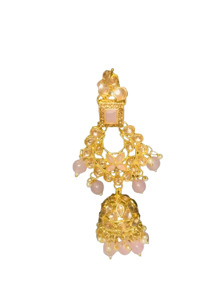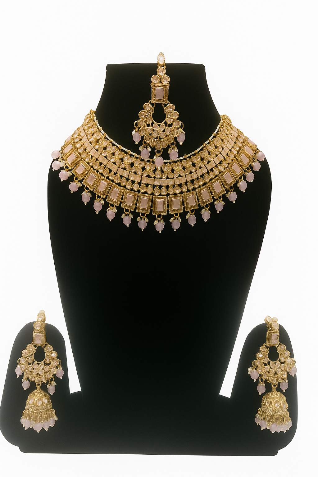 A luxurious gold-plated Kundan bridal set adorned with soft light pink beads. Includes a statement choker, matching earrings, and maangtika — perfect for weddings and festive occasions.